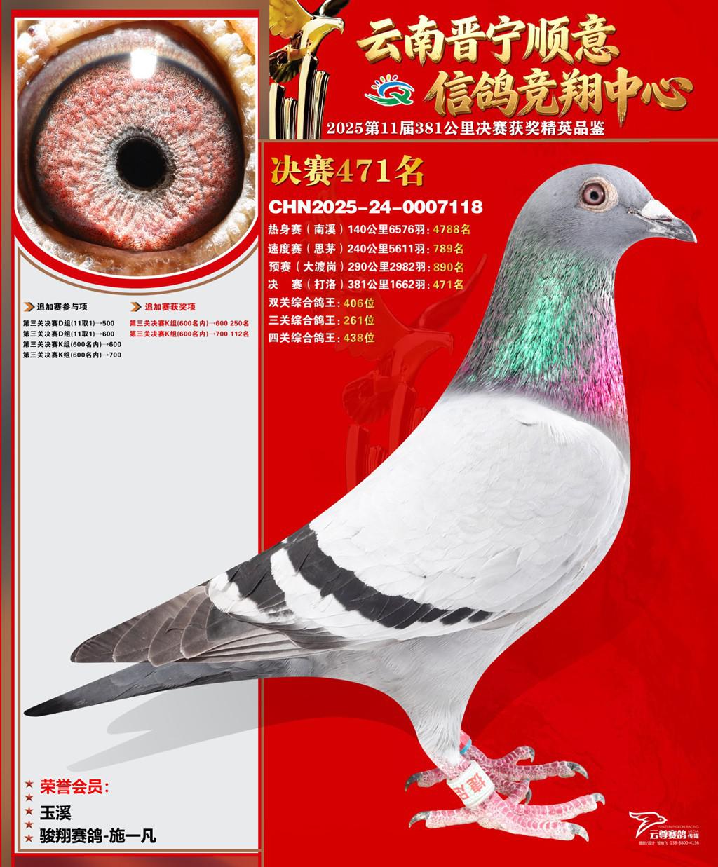 云南晋宁顺意信鸽竞翔中心2025决赛471名骏翔赛鸽-施一凡2025-24-0007118玉溪获奖鸽展示!
