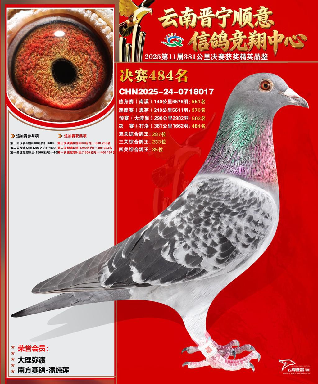 云南晋宁顺意信鸽竞翔中心2025决赛484名南方赛鸽-潘纯莲2025-24-0718017大理弥渡获奖鸽展示!