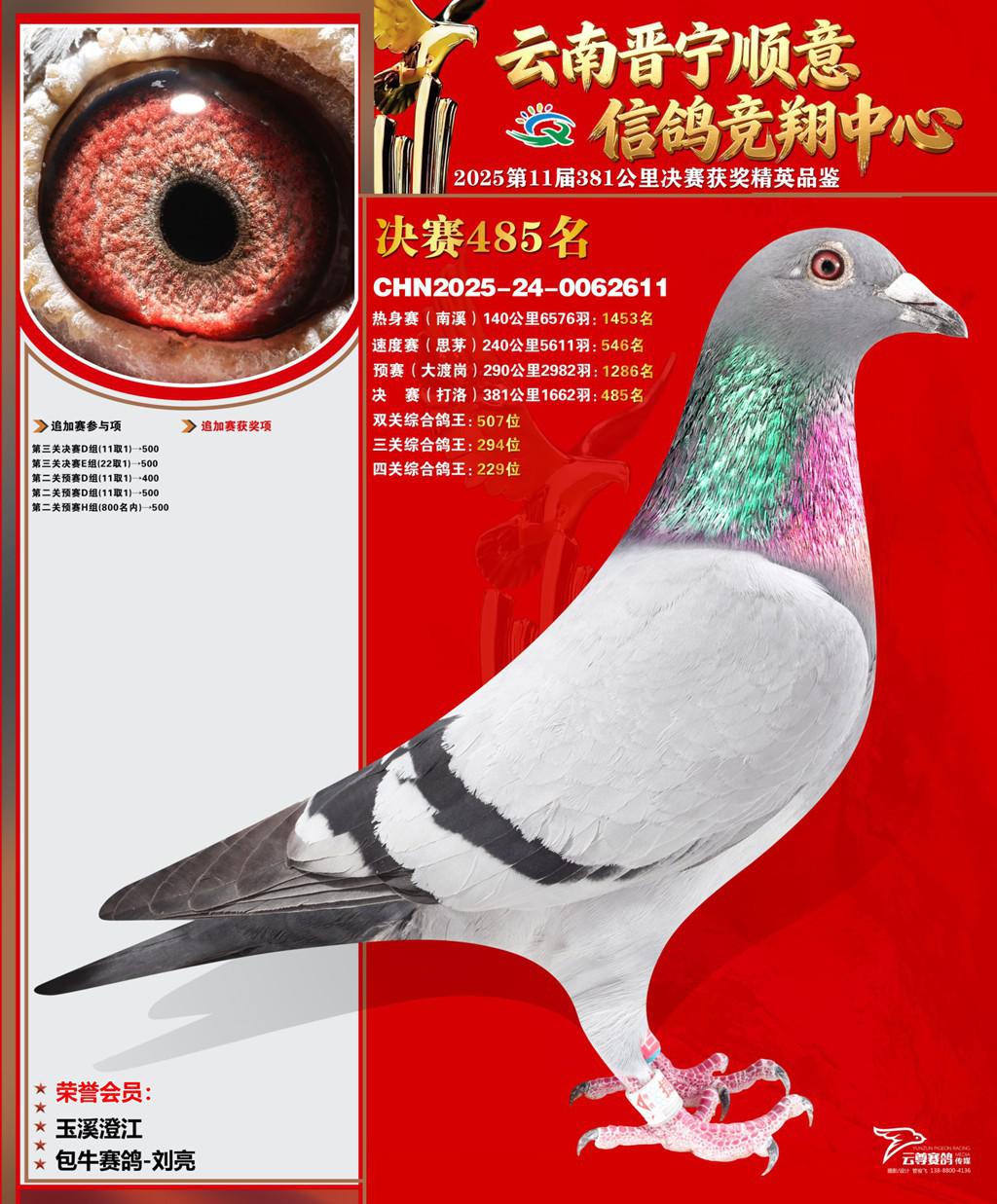 云南晋宁顺意信鸽竞翔中心2025决赛485名包牛赛鸽-刘亮2025-24-0062611玉溪澄江获奖鸽展示!