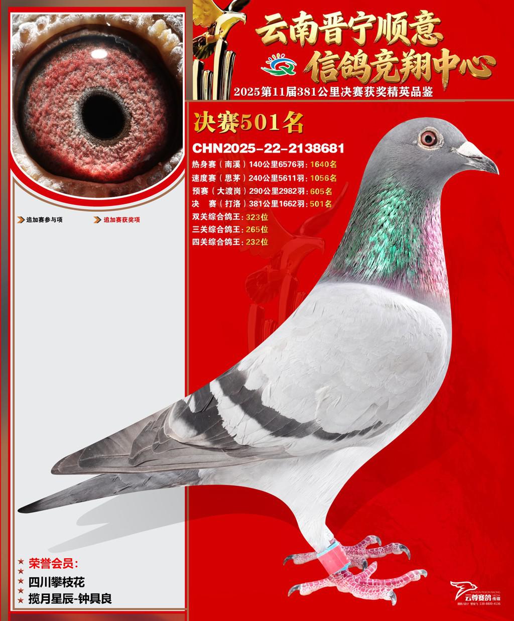 云南晋宁顺意信鸽竞翔中心2025决赛501名揽月星辰-钟具良2025-22-2138681四川攀枝花获奖鸽展示!