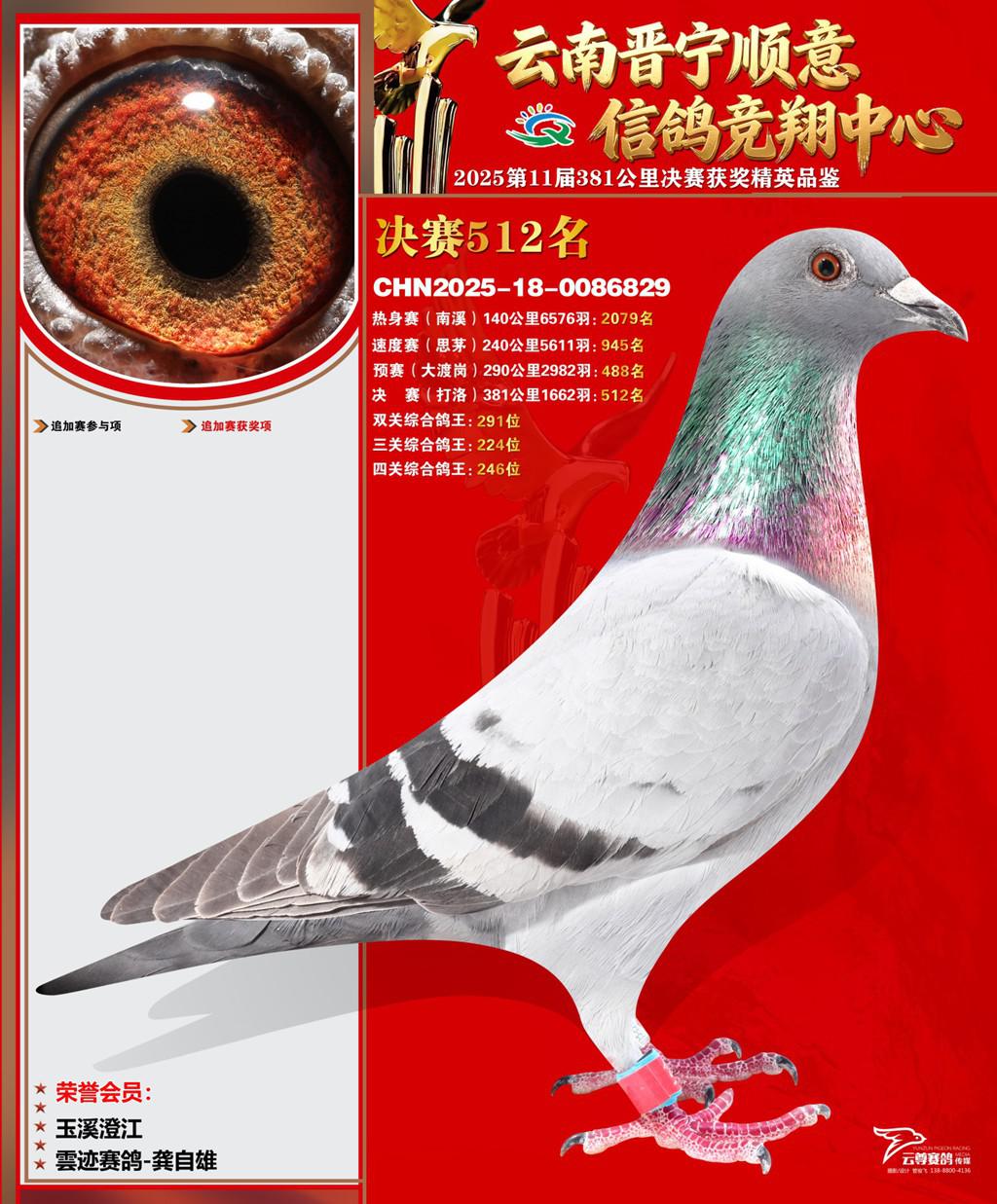云南晋宁顺意信鸽竞翔中心2025决赛512名雲迹赛鸽-龚自雄2025-18-0086829玉溪澄江获奖鸽展示!