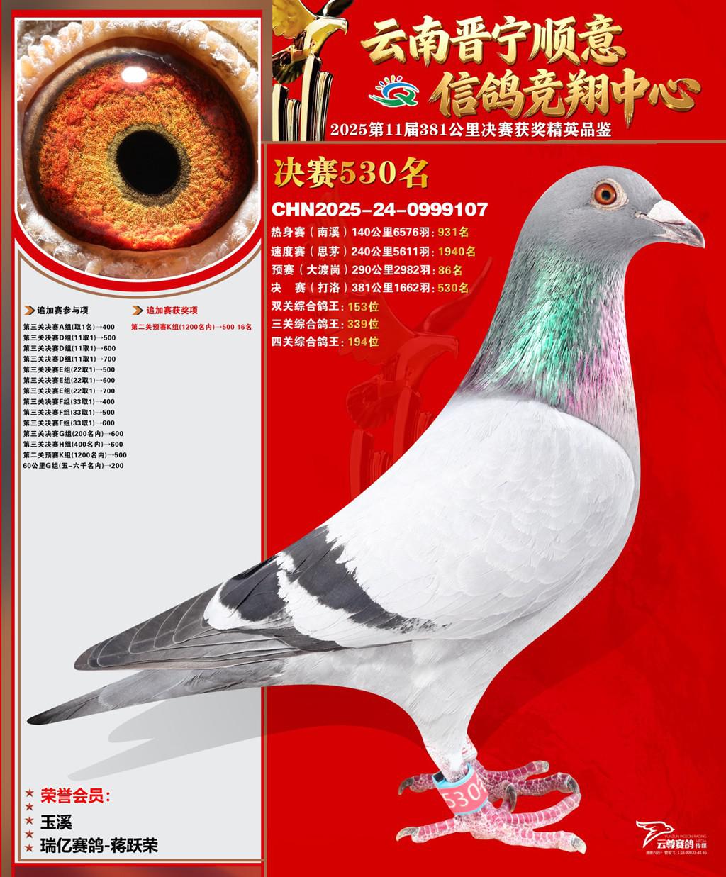 云南晋宁顺意信鸽竞翔中心2025决赛530名瑞亿赛鸽-蒋跃荣2025-24-0999107玉溪获奖鸽展示!