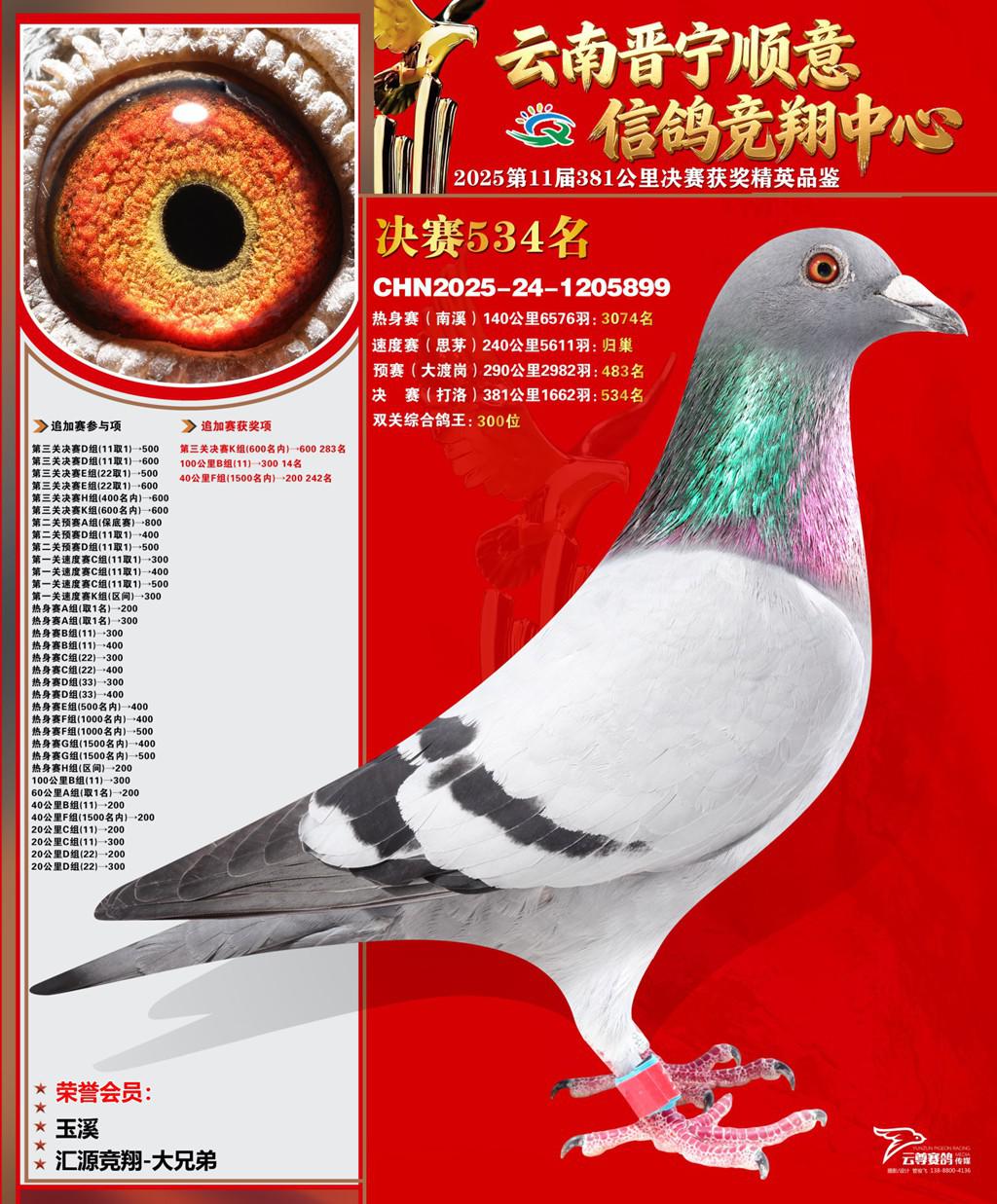 云南晋宁顺意信鸽竞翔中心2025决赛534名汇源竞翔-大兄弟2025-24-1205899玉溪获奖鸽展示!