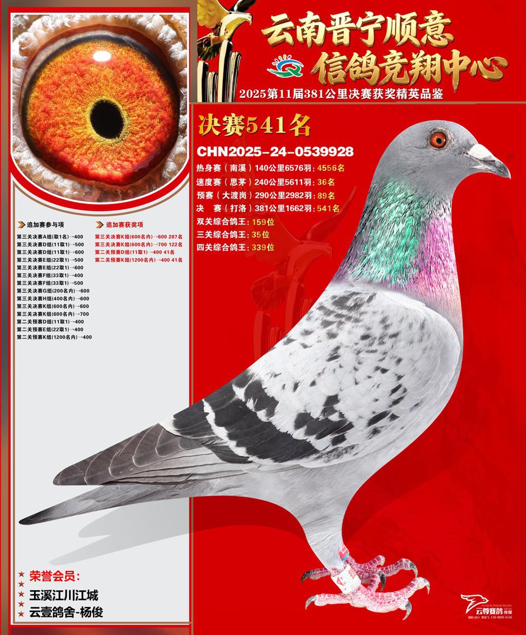 云南晋宁顺意信鸽竞翔中心2025决赛541名云壹鸽舍-杨俊2025-24-0539928玉溪江川江城获奖鸽展示!