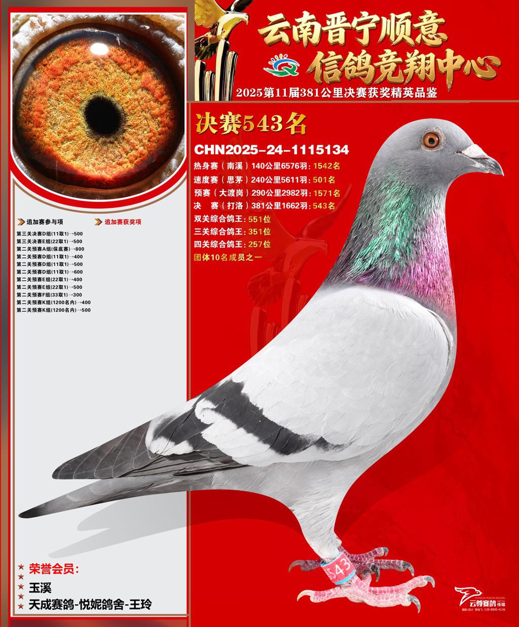 云南晋宁顺意信鸽竞翔中心2025决赛543名天成赛鸽-悦妮鸽舍-王玲2025-24-1115134玉溪获奖鸽展示!