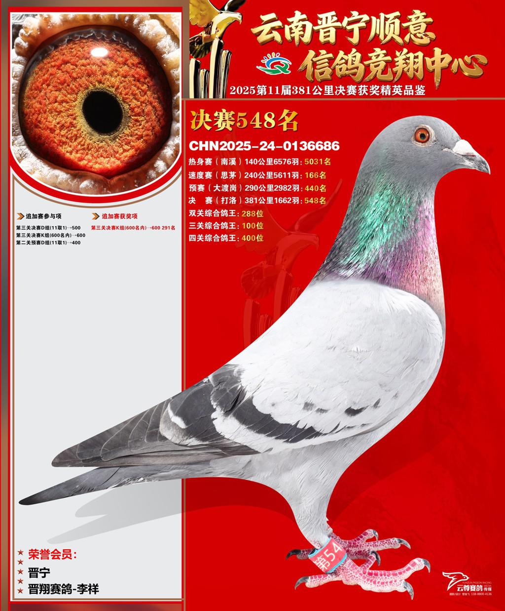 云南晋宁顺意信鸽竞翔中心2025决赛548名晋翔赛鸽-李祥2025-24-0136686晋宁获奖鸽展示!