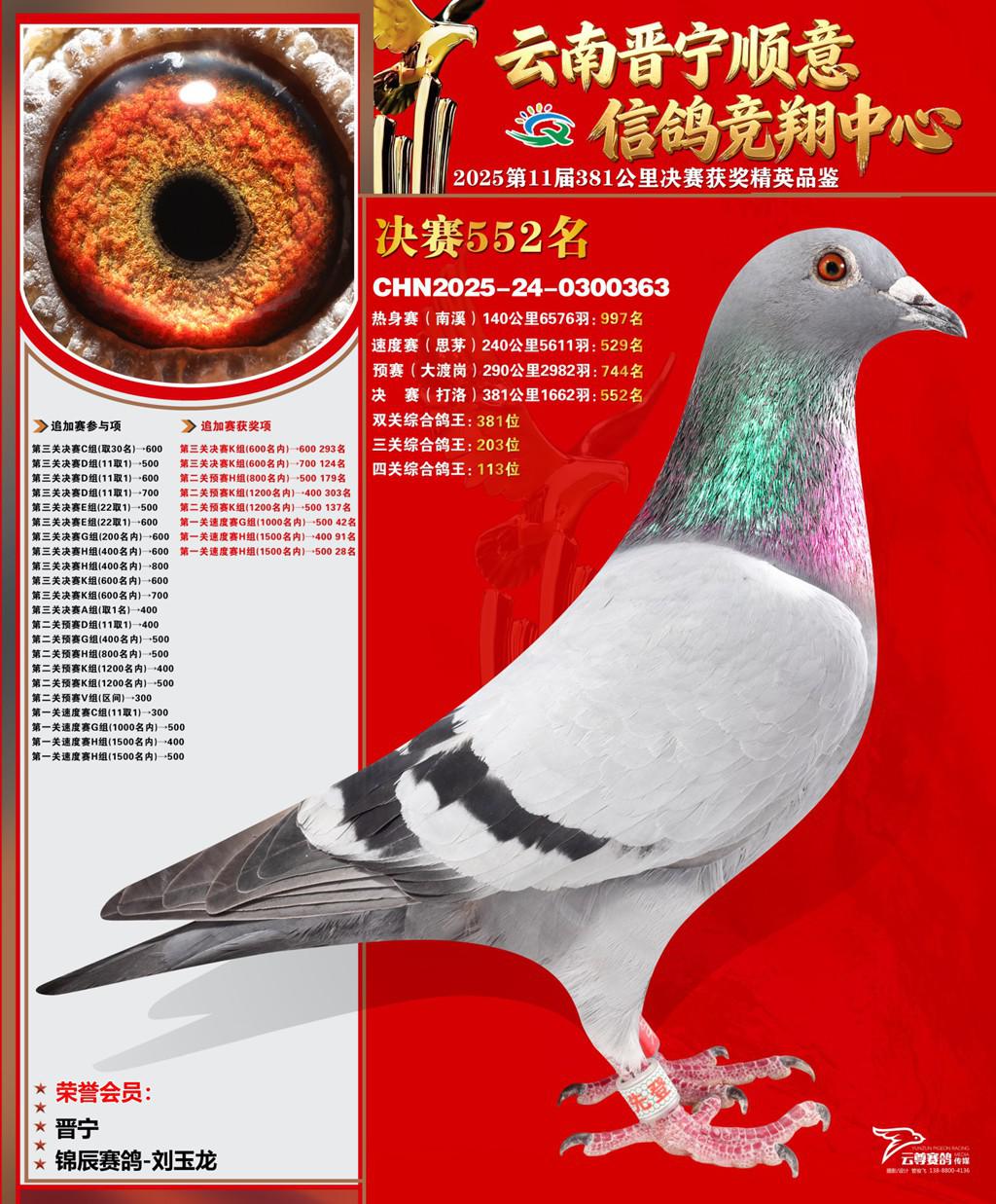 云南晋宁顺意信鸽竞翔中心2025决赛552名锦辰赛鸽-刘玉龙2025-24-0300363晋宁获奖鸽展示!