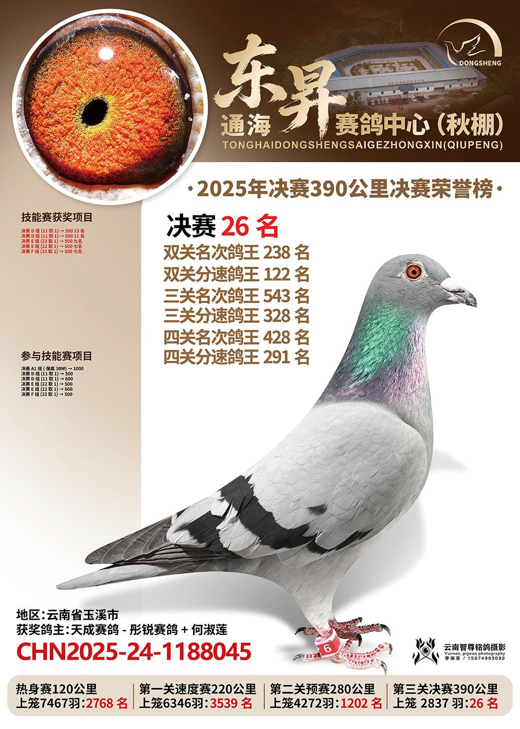 通海东昇赛鸽中心2025决赛26名天成赛鸽-彤锐赛鸽+何淑莲CHN2025-24-1188045云南省玉溪市获奖鸽展示!