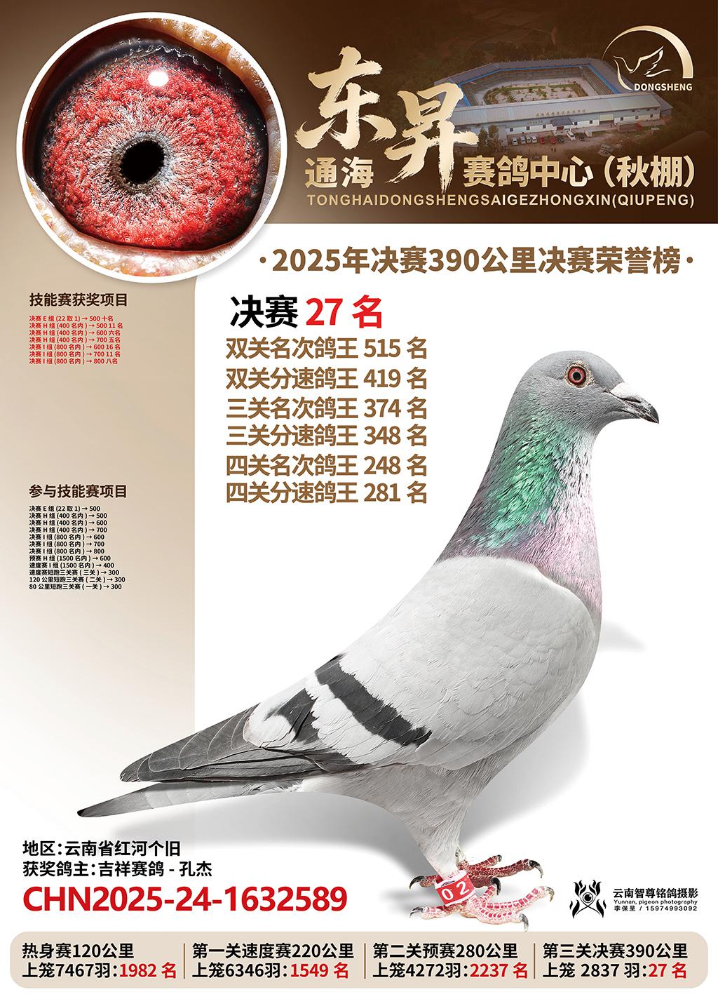 通海东昇赛鸽中心2025决赛27名吉祥赛鸽-孔杰CHN2025-24-1632589云南省红河个旧获奖鸽展示!