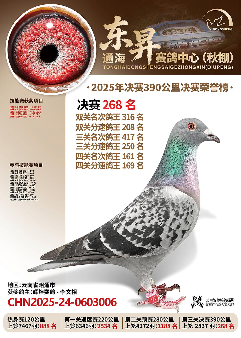 通海东昇赛鸽中心2025决赛268名辉煌赛鸽-李文相CHN2025-24-0603006云南省昭通市获奖鸽展示!