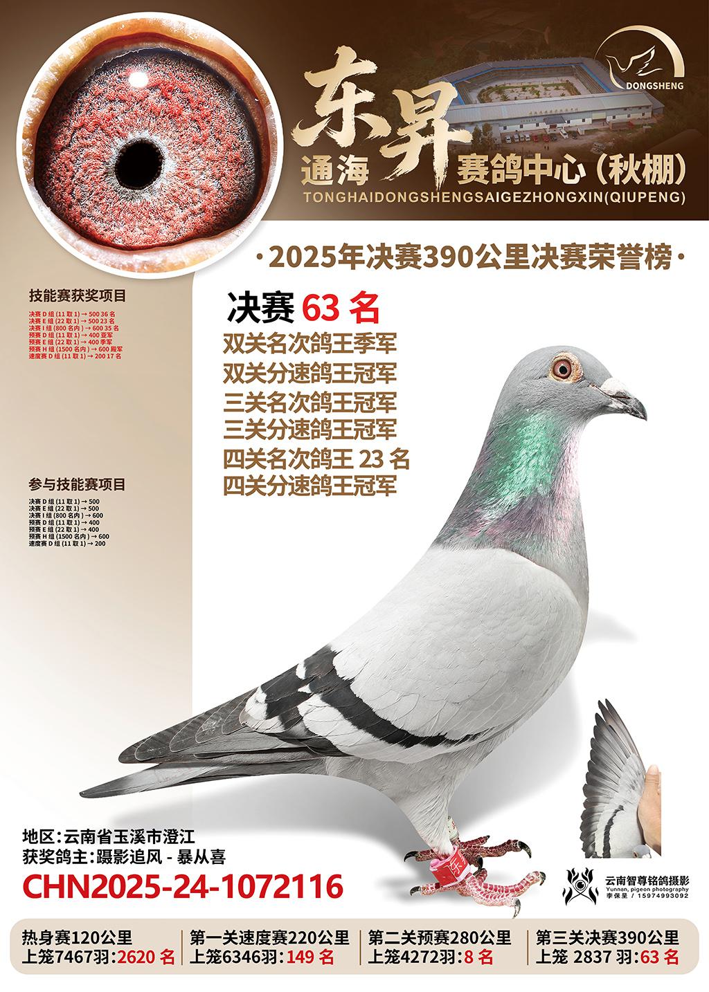 通海东昇赛鸽中心2025决赛63名蹑影追风-暴从喜CHN2025-24-1072116云南省玉溪市澄江获奖鸽展示!