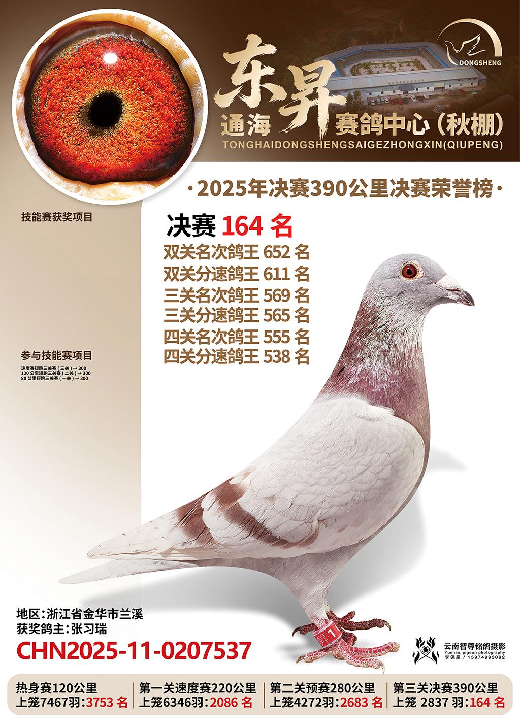 通海东昇赛鸽中心2025决赛164名张习瑞CHN2025-11-0207537浙江省金华市兰溪获奖鸽展示!