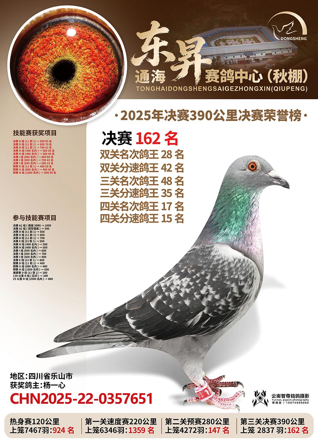 通海东昇赛鸽中心2025决赛162名杨一心CHN2025-22-0357651四川省乐山市获奖鸽展示!