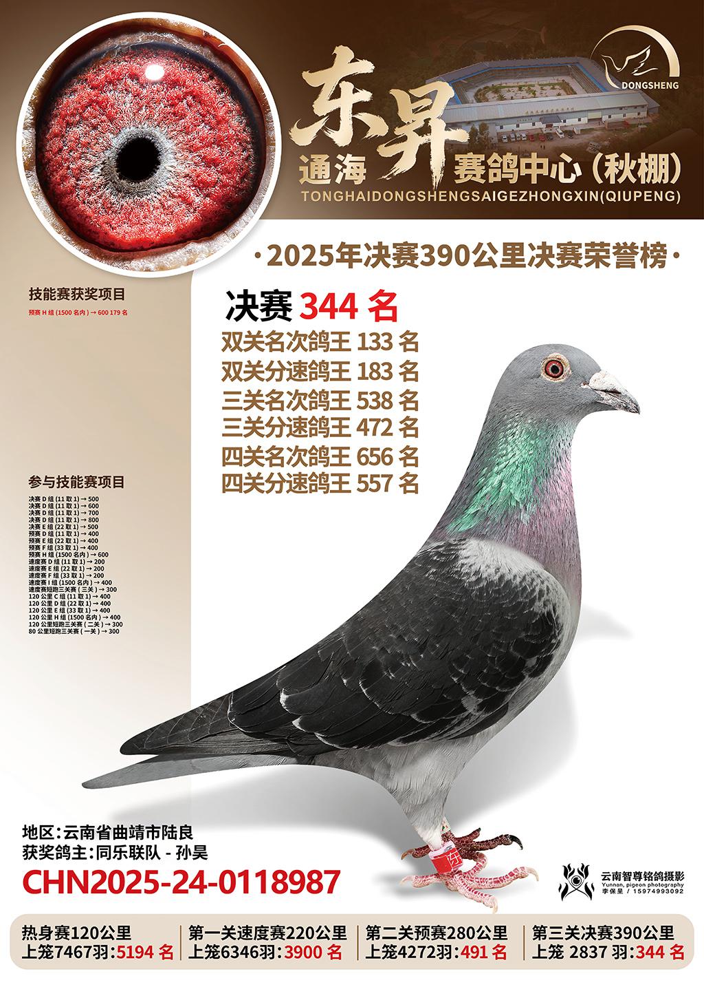 通海东昇赛鸽中心2025决赛344名同乐联队-孙昊CHN2025-24-0118987云南省曲靖市陆良获奖鸽展示!