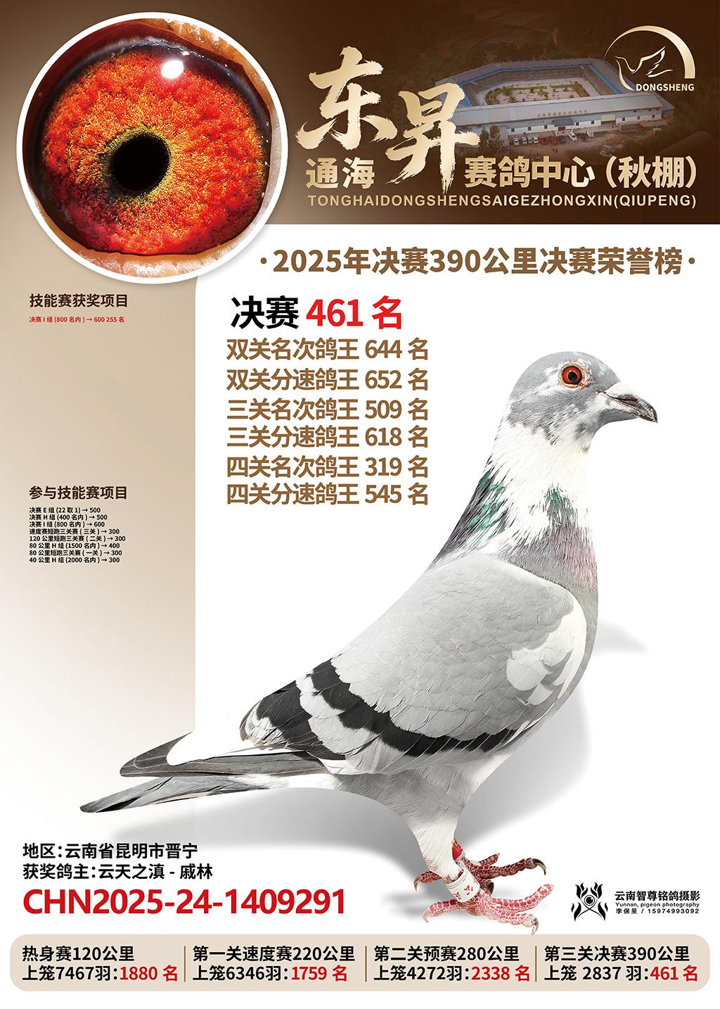 通海东昇赛鸽中心2025决赛461名云天之滇-戚林CHN2025-24-1409291云南省昆明市晋宁获奖鸽展示!