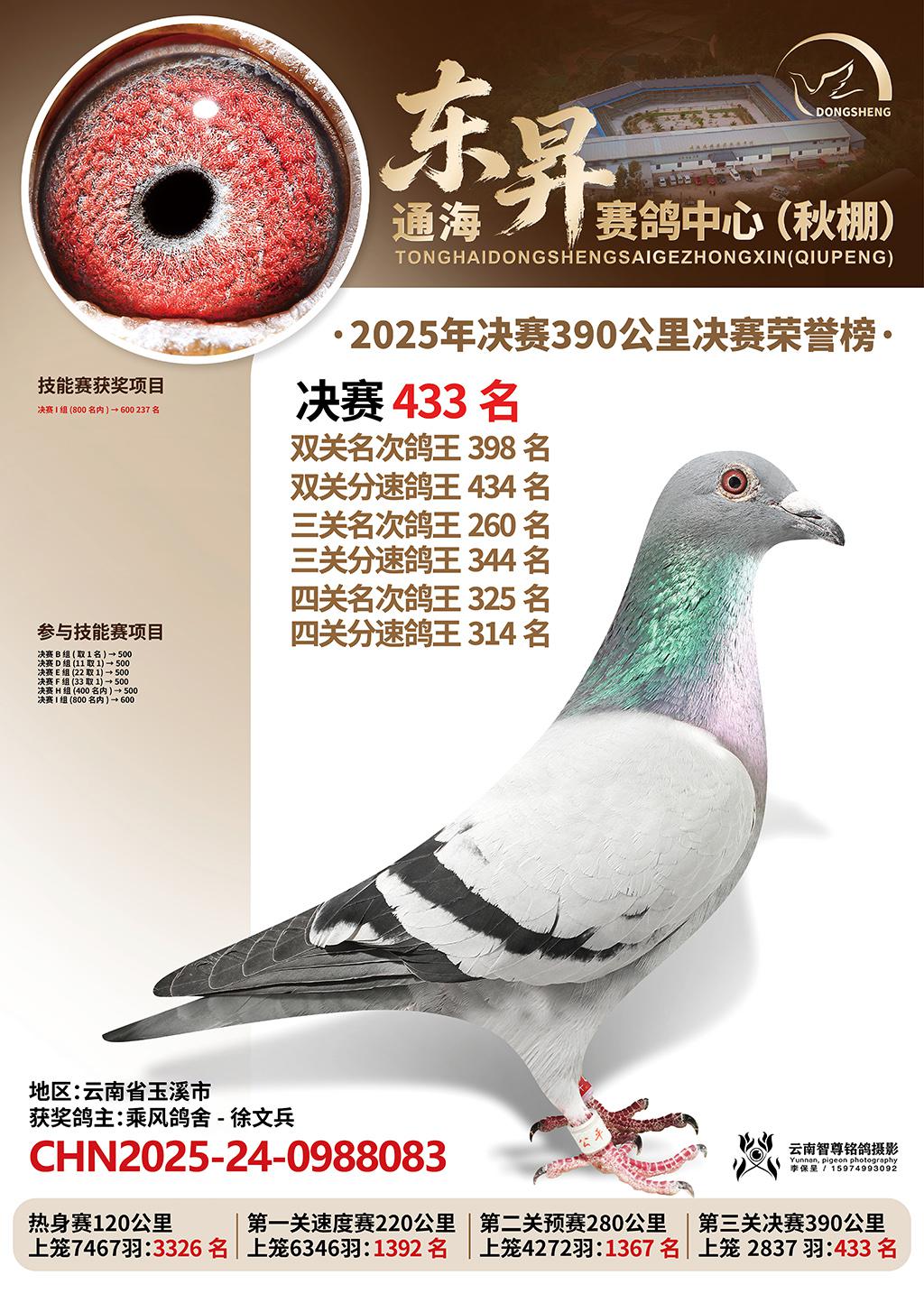 通海东昇赛鸽中心2025决赛433名乘风鸽舍-徐文兵CHN2025-24-0988083云南省玉溪市获奖鸽展示!