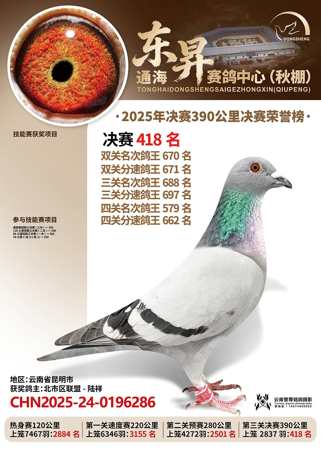 通海东昇赛鸽中心2025决赛418名北市区联盟-陆祥CHN2025-24-0196286云南省昆明市获奖鸽展示!