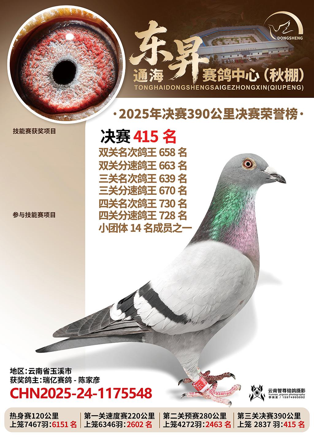 通海东昇赛鸽中心2025决赛415名瑞亿赛鸽-陈家彦CHN2025-24-1175548云南省玉溪市获奖鸽展示!