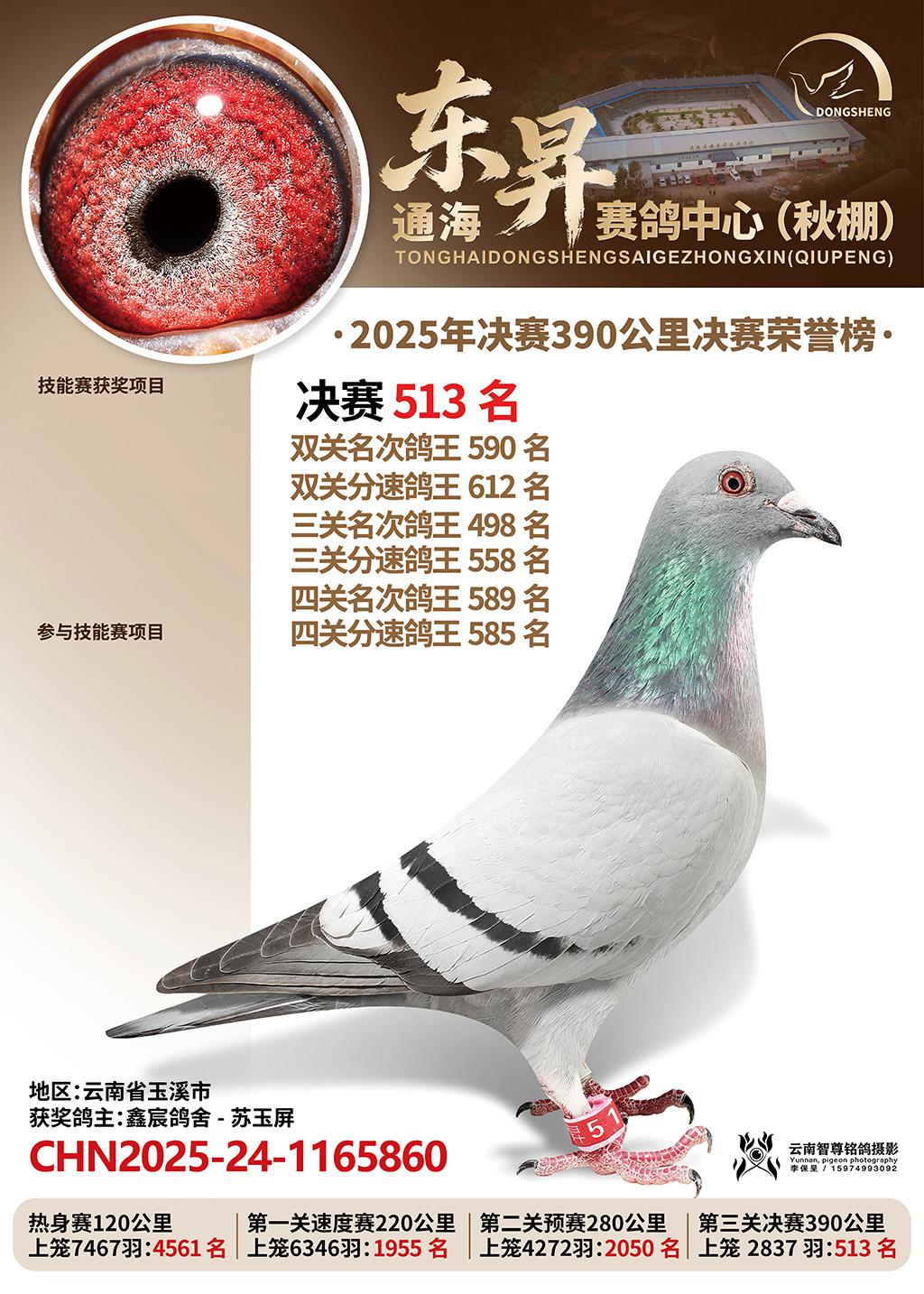 通海东昇赛鸽中心2025决赛513名鑫宸鸽舍-苏玉屏CHN2025-24-1165860云南省玉溪市获奖鸽展示!