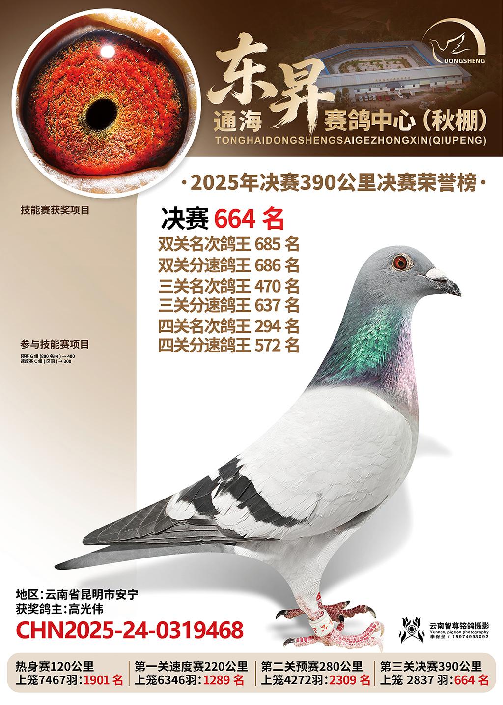通海东昇赛鸽中心2025决赛664名高光伟CHN2025-24-0319468云南省昆明市安宁获奖鸽展示!