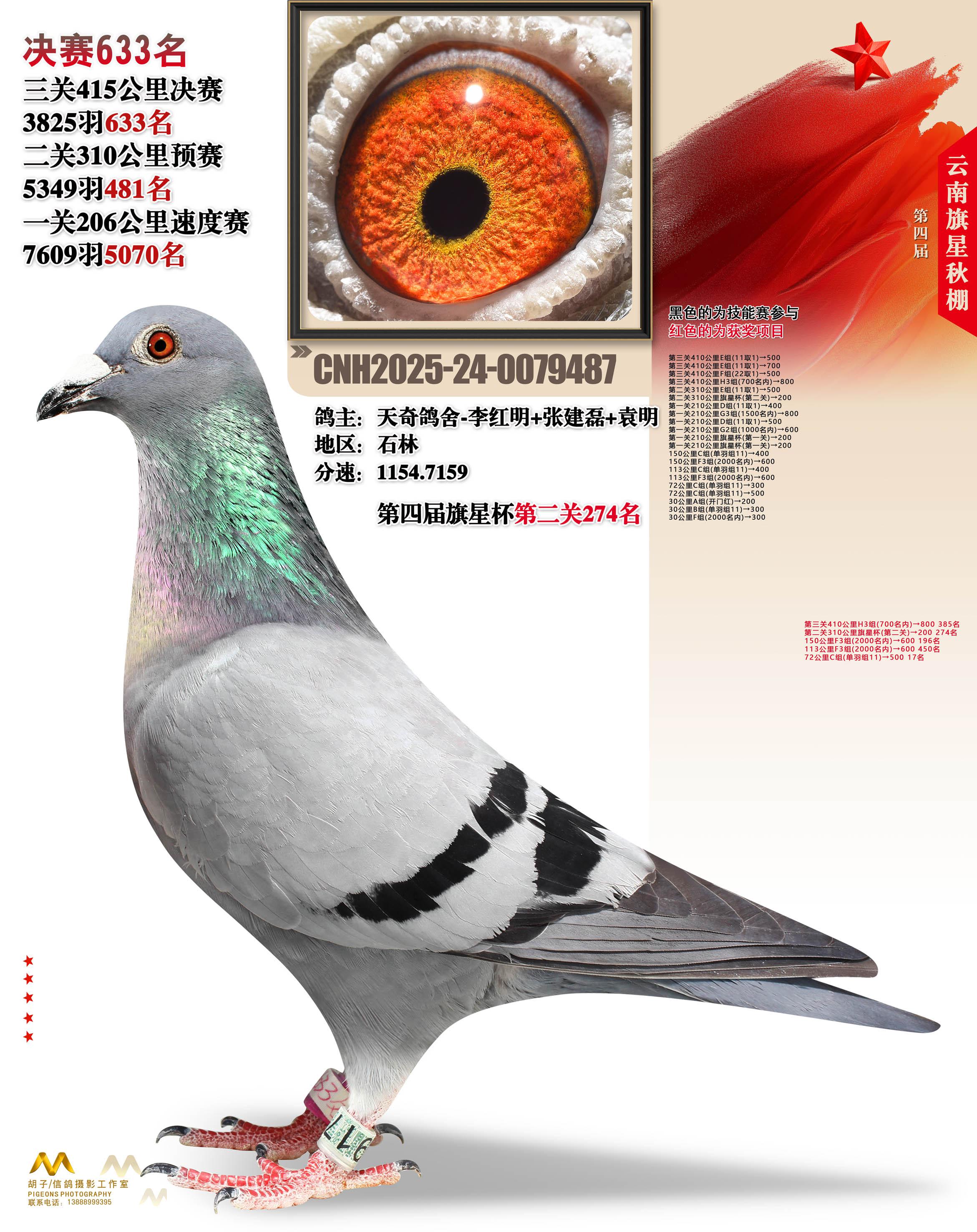 云南大理旗星赛鸽中心2025决赛633名天奇鸽舍-李红明+张建磊+袁明24-0079487石林获奖鸽展示!