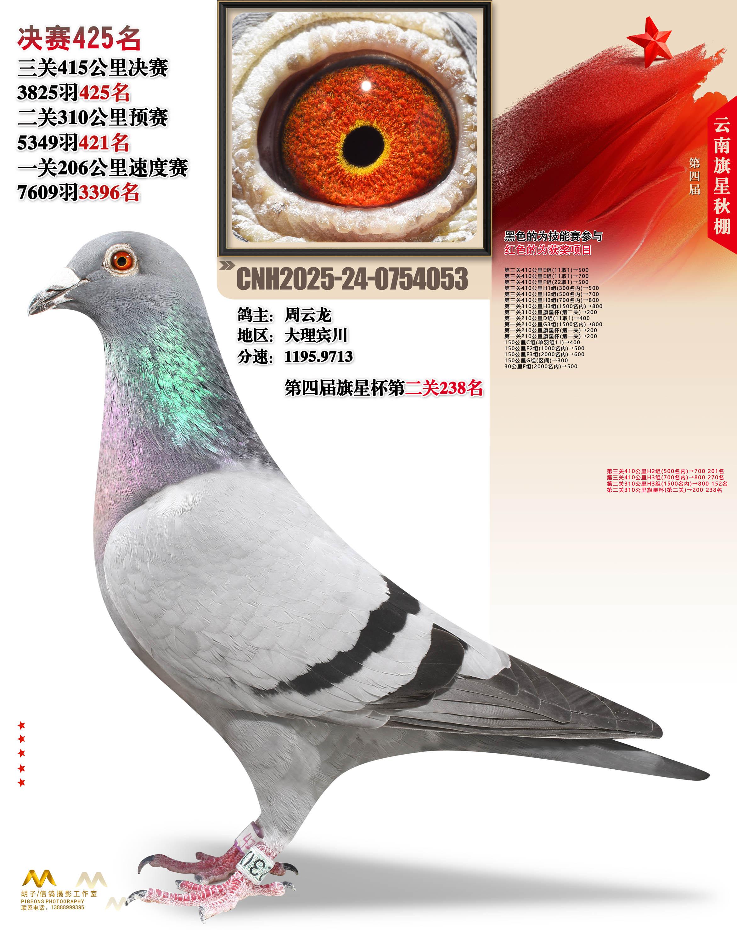 云南大理旗星赛鸽中心2025决赛425名周云龙24-0754053大理宾川获奖鸽展示!