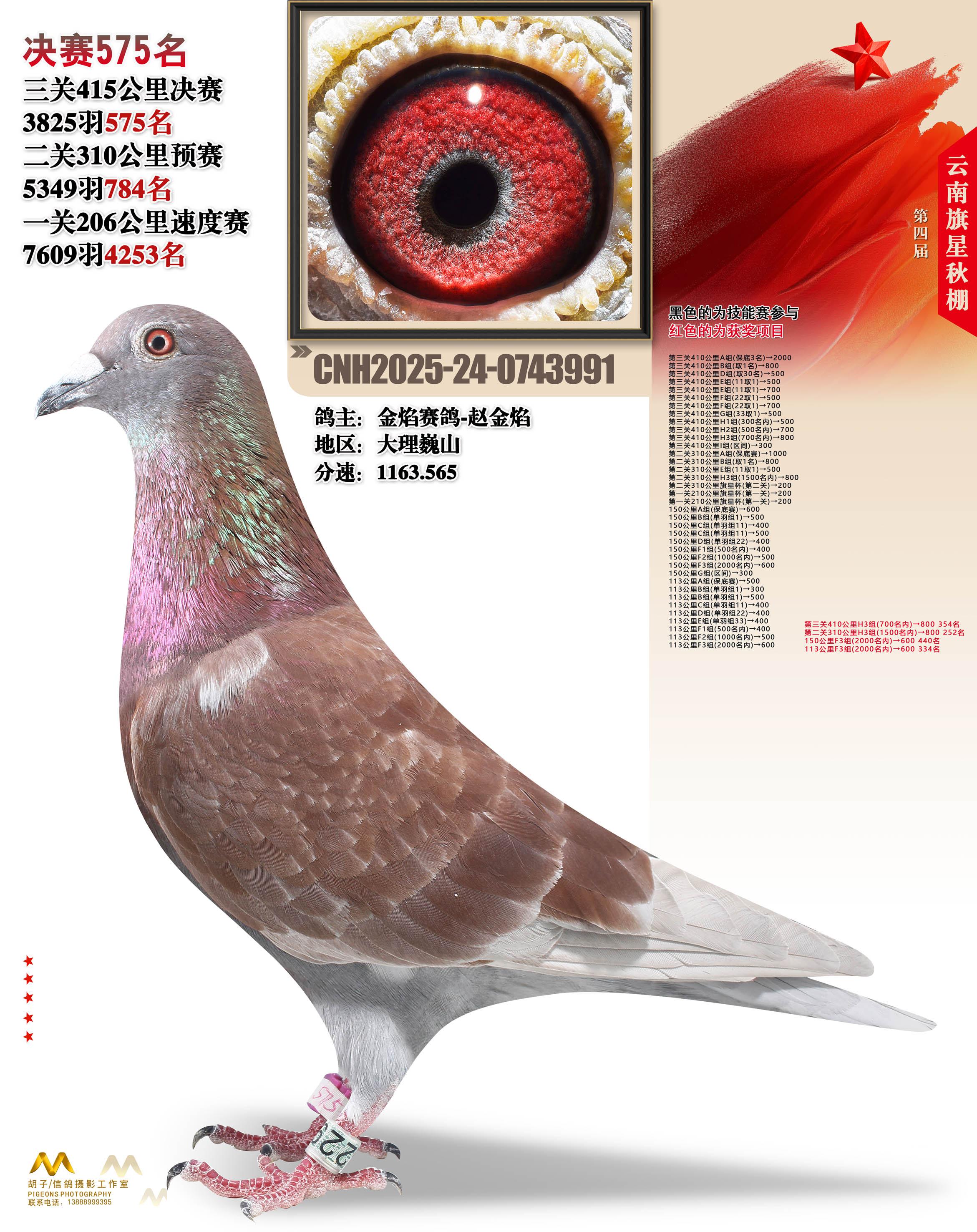 云南大理旗星赛鸽中心2025决赛575名金焰赛鸽-赵金焰24-0743991大理巍山获奖鸽展示!