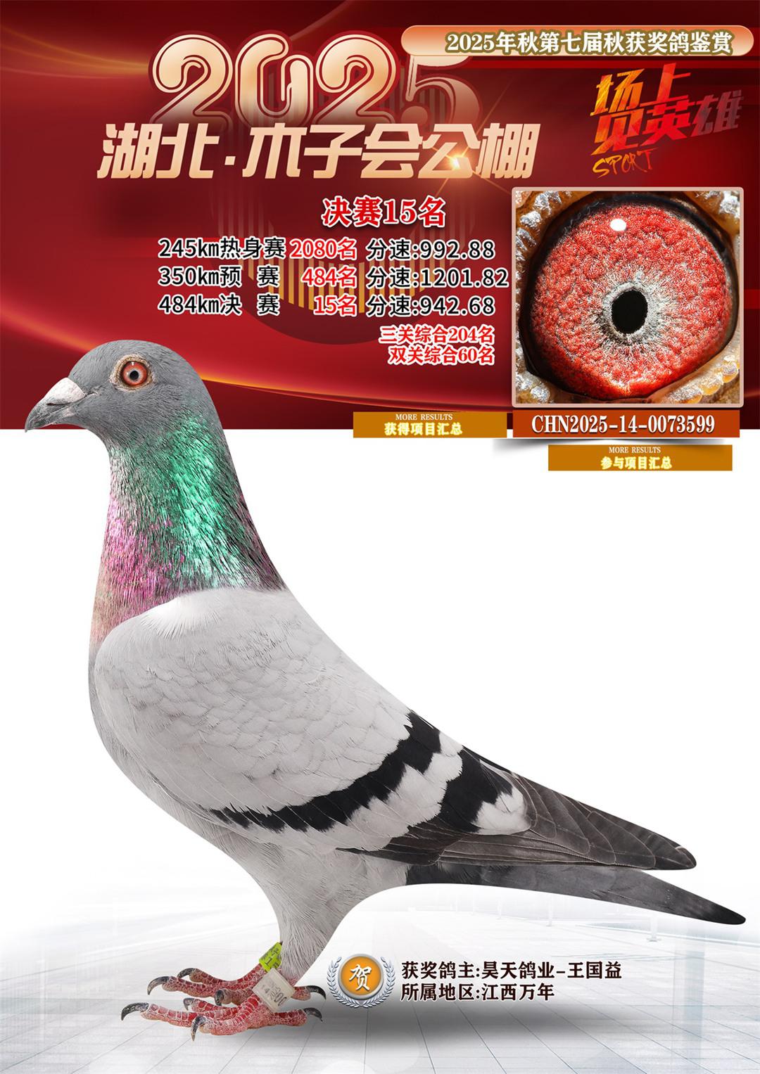 湖北省木子会公棚2025决赛15名昊天鸽业-王国益14-0073599江西万年获奖鸽展示!