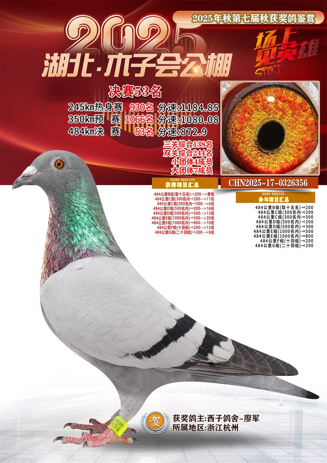 湖北省木子会公棚2025决赛53名西子鸽舍-廖军17-0326356浙江杭州获奖鸽展示!