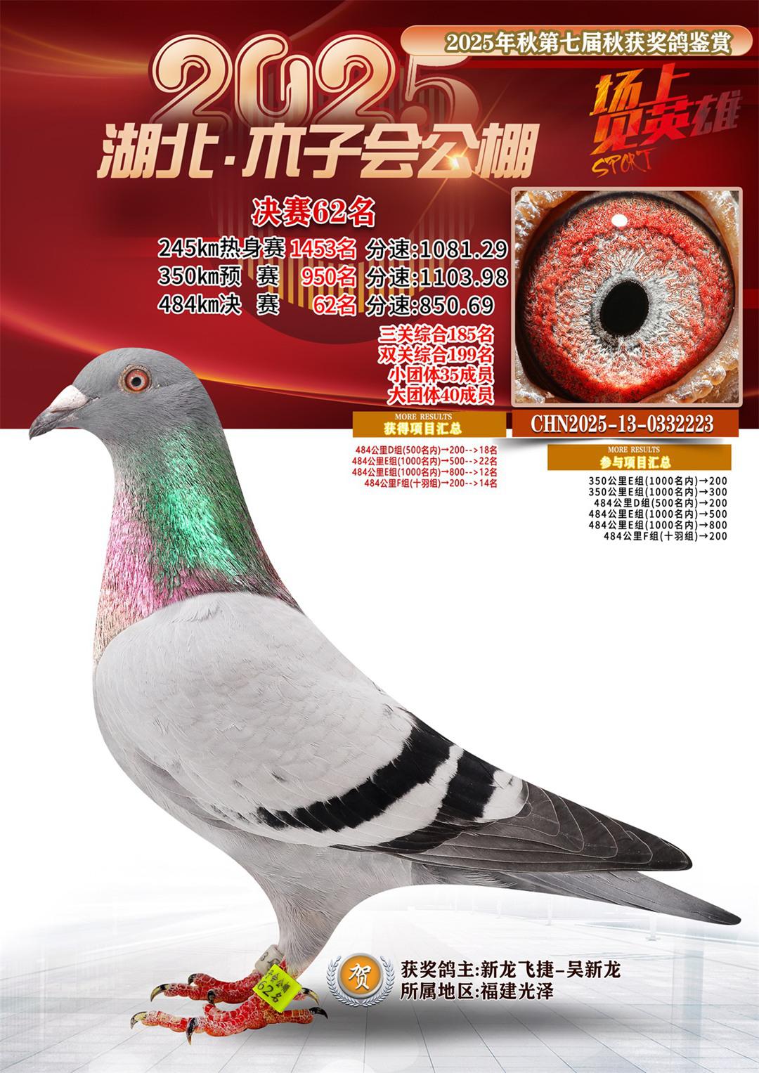 湖北省木子会公棚2025决赛62名新龙飞捷-吴新龙13-0332223福建光泽获奖鸽展示!