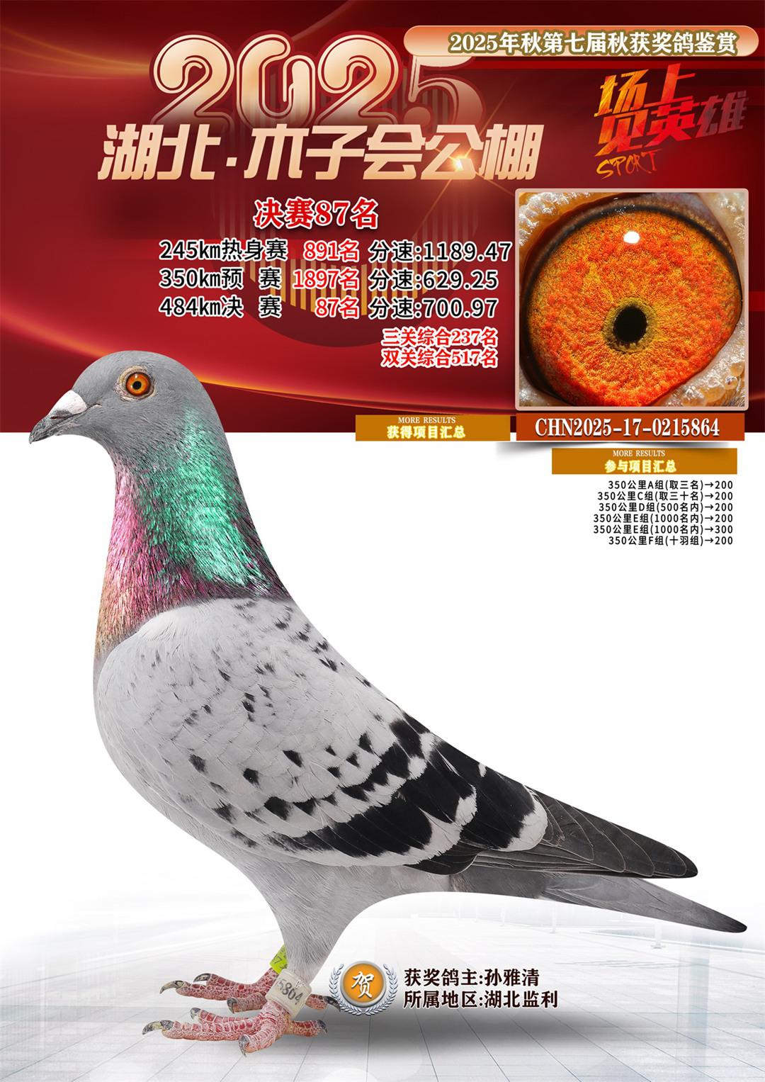 湖北省木子会公棚2025决赛87名孙雅清17-0215864湖北监利获奖鸽展示!