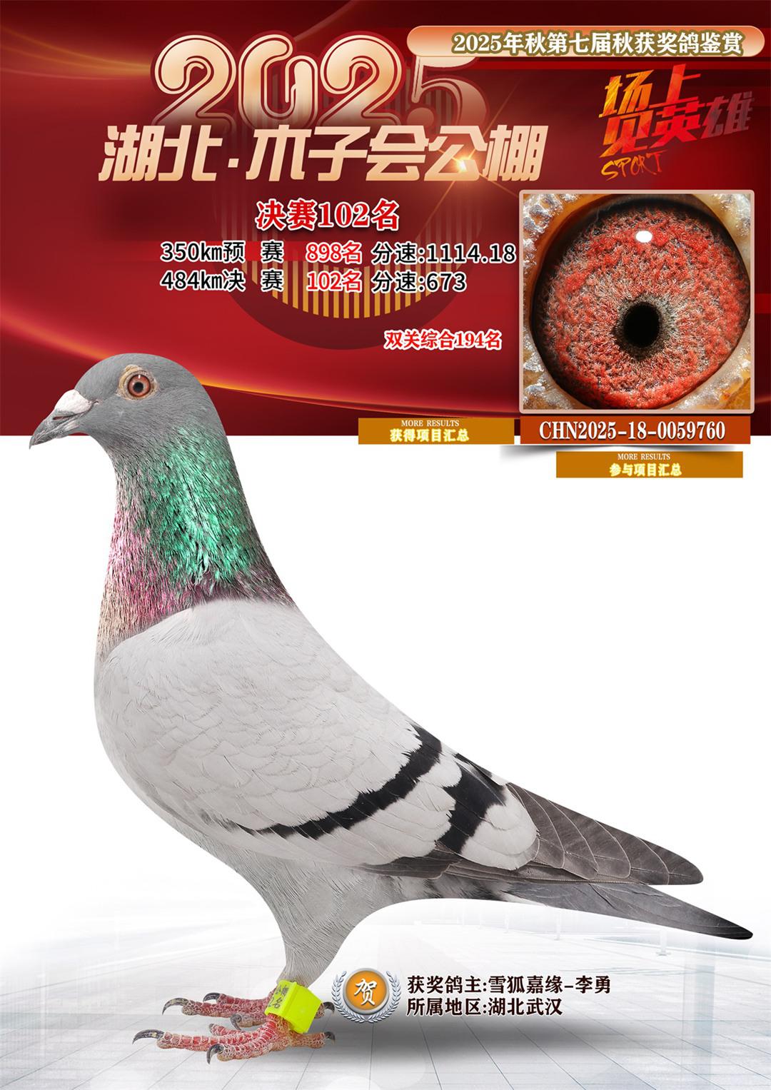 湖北省木子会公棚2025决赛102名18-0059760获奖鸽展示!