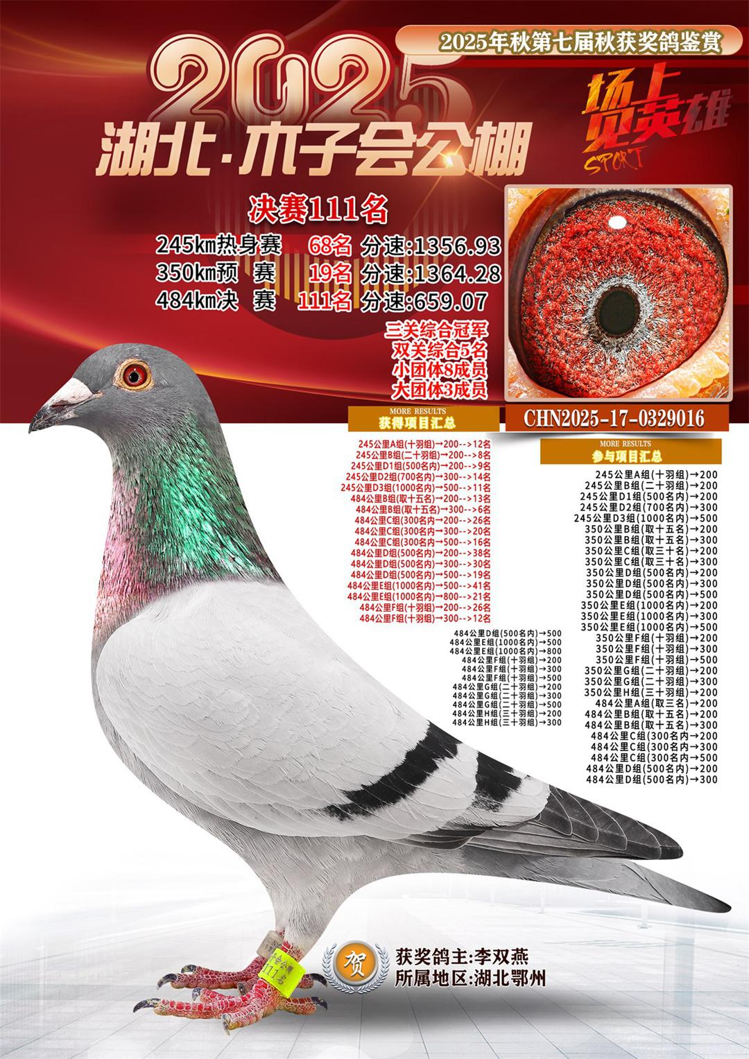 湖北省木子会公棚2025决赛111名李双燕17-0329016湖北鄂州获奖鸽展示!