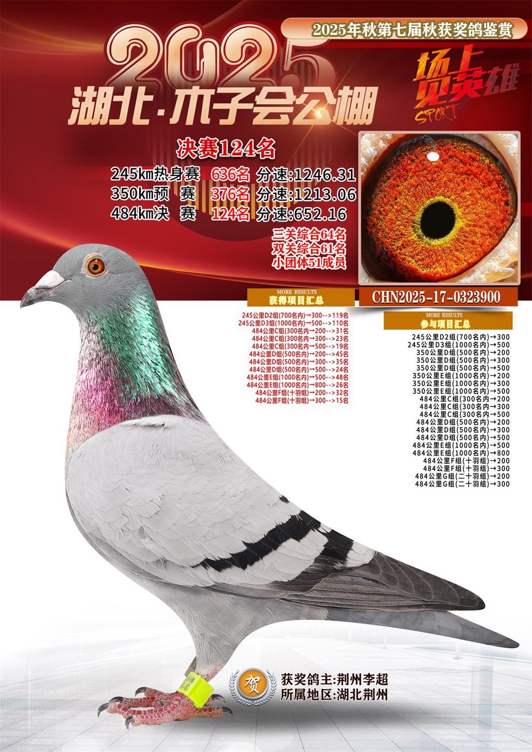 湖北省木子会公棚2025决赛124名荆州李超17-0323900湖北荆州获奖鸽展示!