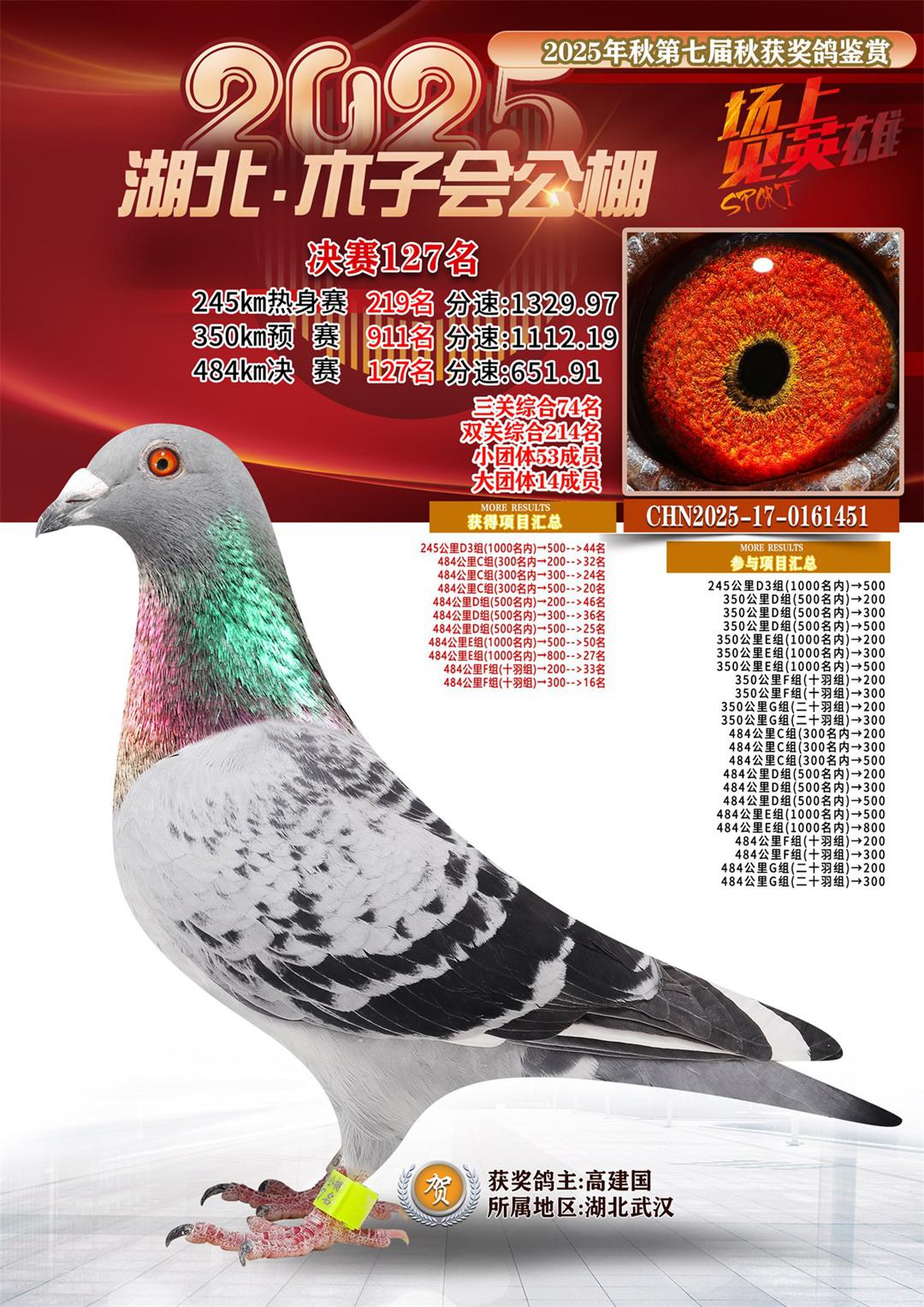 湖北省木子会公棚2025决赛127名高建国17-0161451湖北武汉获奖鸽展示!