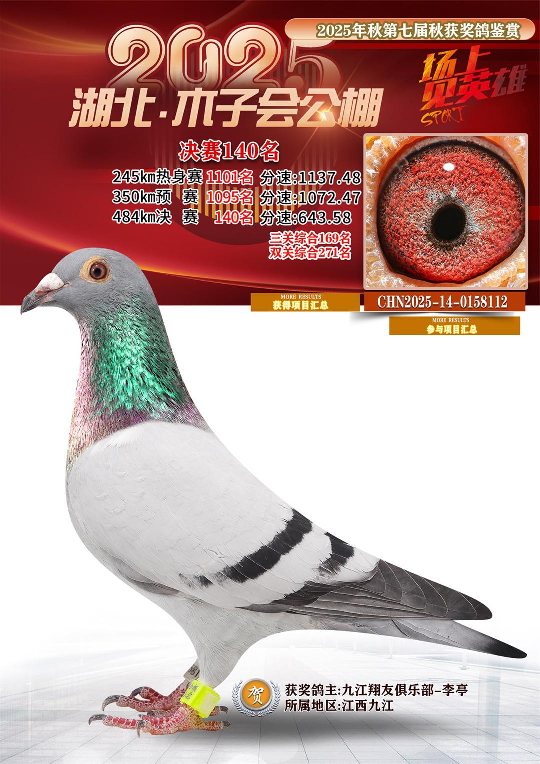 湖北省木子会公棚2025决赛140名九江翔友俱乐部-李亭14-0158112江西九江获奖鸽展示!