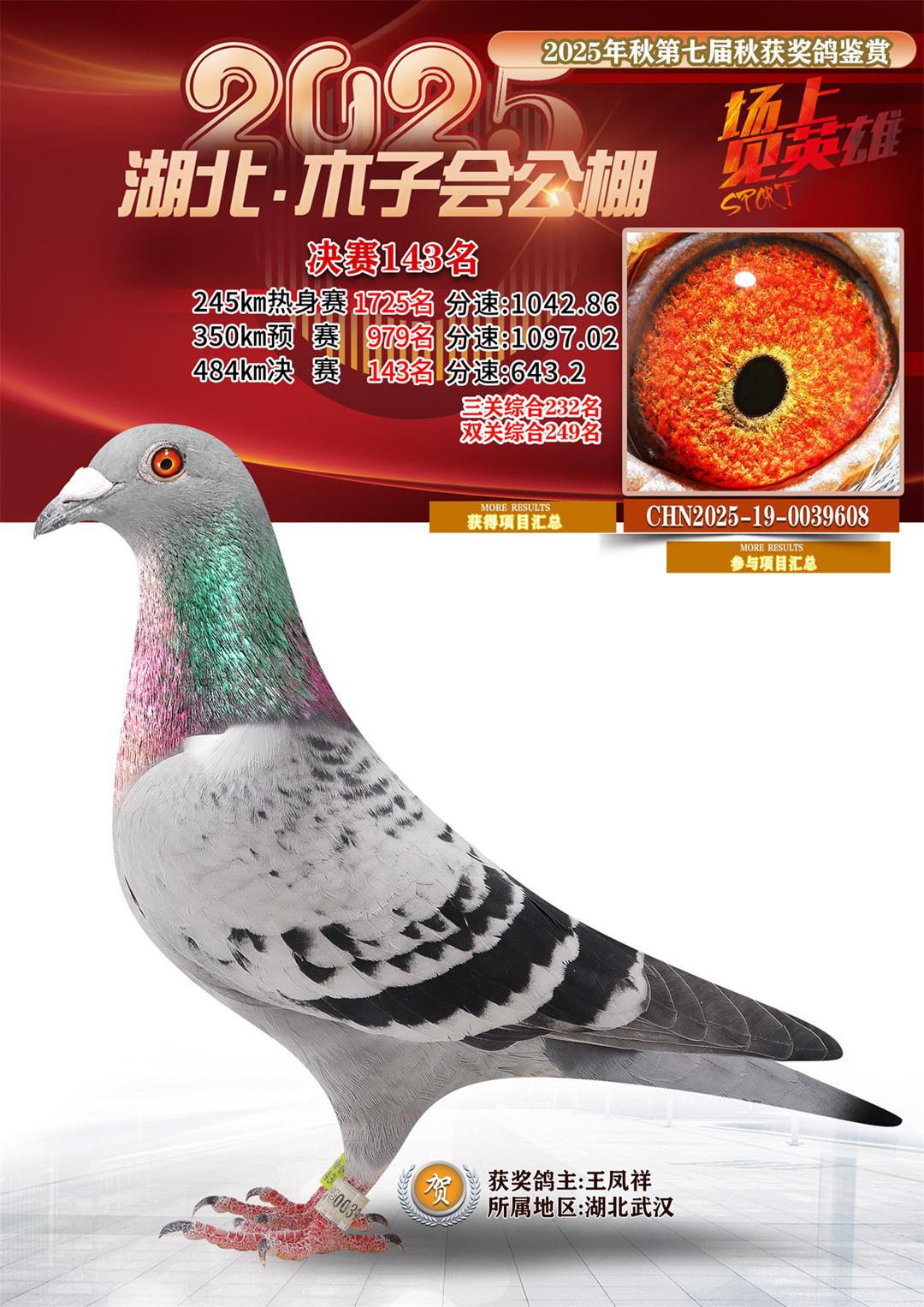 湖北省木子会公棚2025决赛143名王凤祥19-0039608湖北武汉获奖鸽展示!