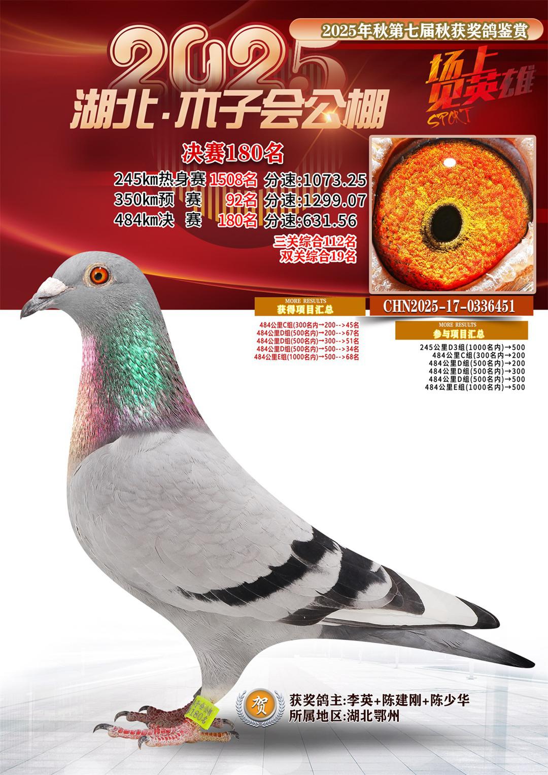湖北省木子会公棚2025决赛180名李英+陈建刚+陈少华17-0336451湖北鄂州获奖鸽展示!