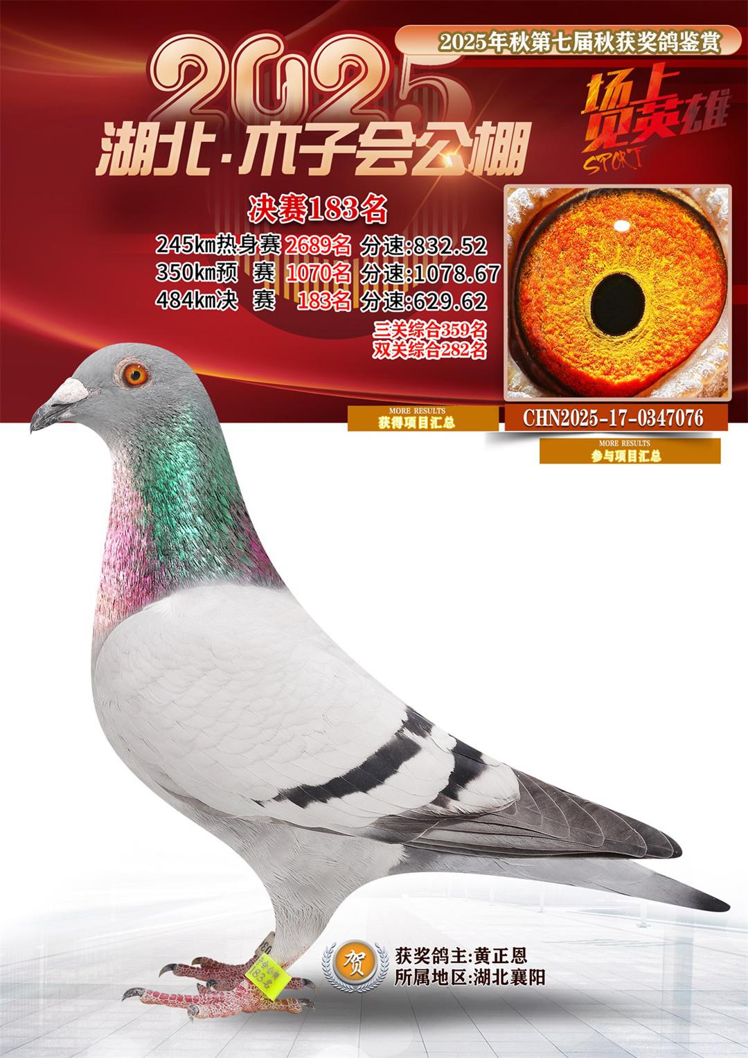 湖北省木子会公棚2025决赛183名黄正恩17-0347076湖北襄阳获奖鸽展示!