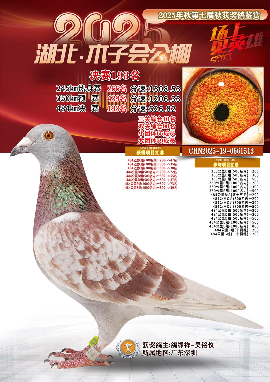 湖北省木子会公棚2025决赛193名鸽缘祥-吴铭仪19-0661513广东深圳获奖鸽展示!