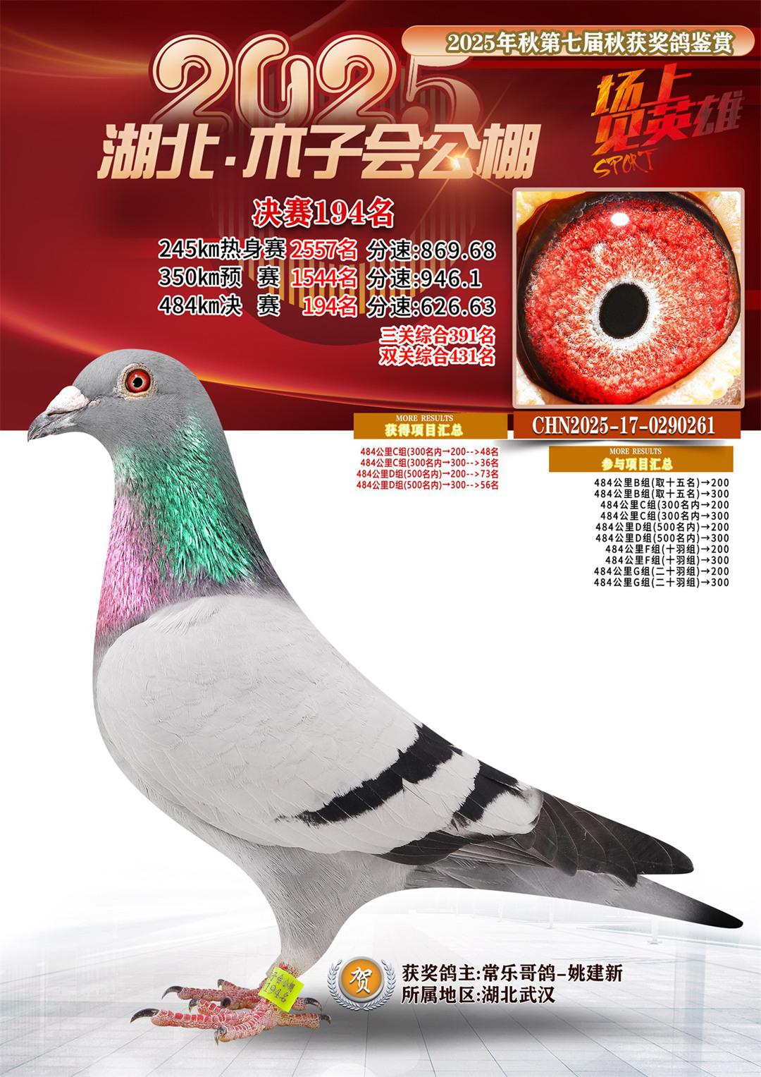 湖北省木子会公棚2025决赛194名常乐哥鸽-姚建新17-0290261湖北武汉获奖鸽展示!