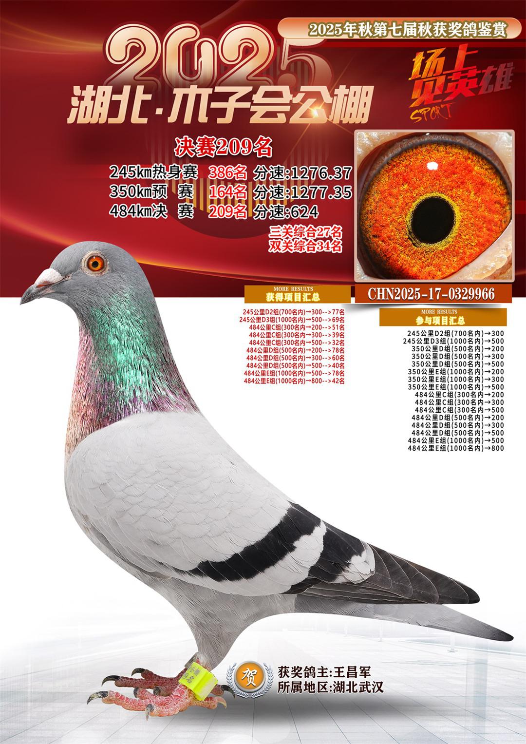 湖北省木子会公棚2025决赛209名王昌军17-0329966湖北武汉获奖鸽展示!
