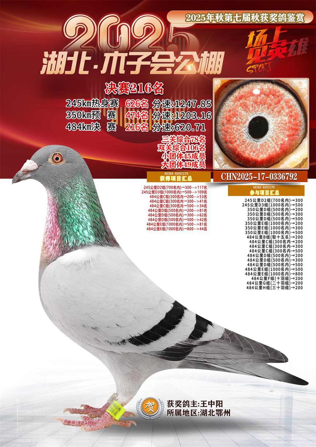 湖北省木子会公棚2025决赛216名王中阳17-0336792湖北鄂州获奖鸽展示!
