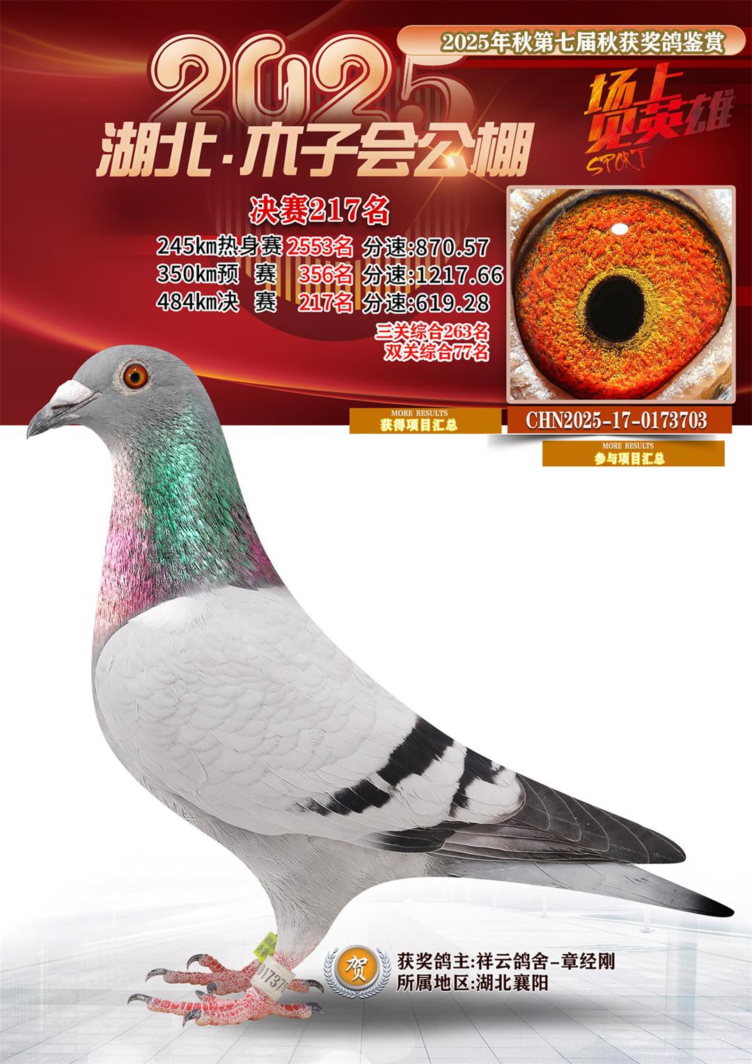 湖北省木子会公棚2025决赛217名祥云鸽舍-章经刚17-0173703湖北襄阳获奖鸽展示!