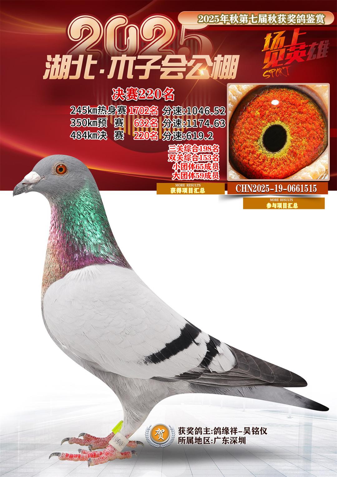湖北省木子会公棚2025决赛220名鸽缘祥-吴铭仪19-0661515广东深圳获奖鸽展示!