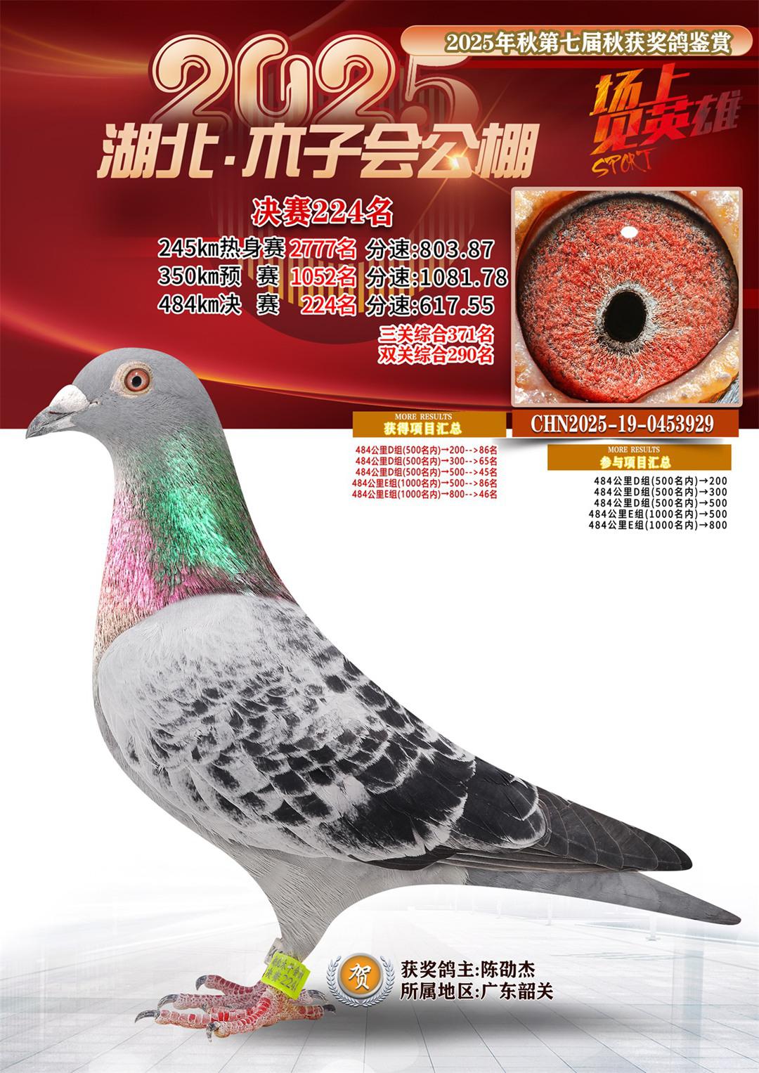 湖北省木子会公棚2025决赛224名陈劭杰19-0453929广东韶关获奖鸽展示!