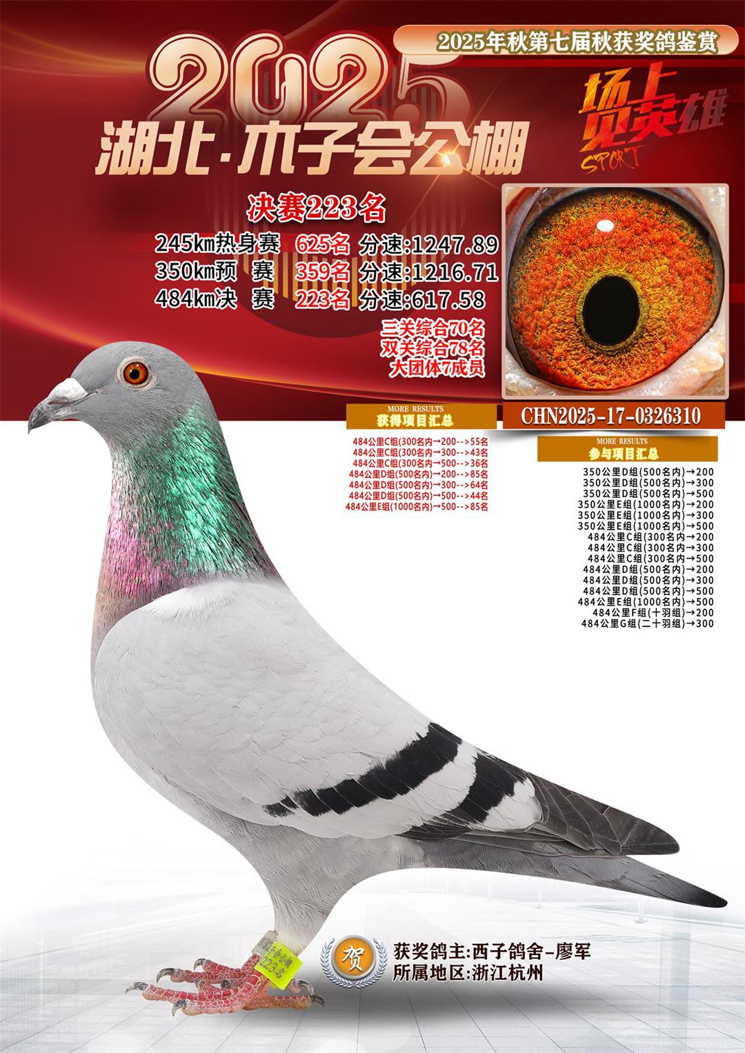 湖北省木子会公棚2025决赛223名西子鸽舍-廖军17-0326310浙江杭州获奖鸽展示!