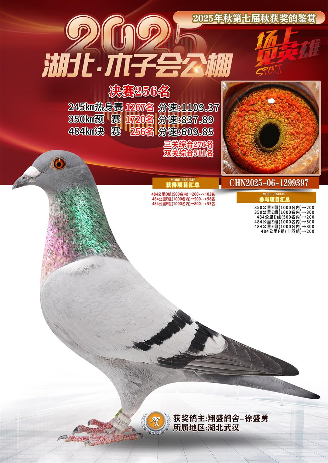 湖北省木子会公棚2025决赛256名翔盛鸽舍-徐盛勇06-1299397湖北武汉获奖鸽展示!