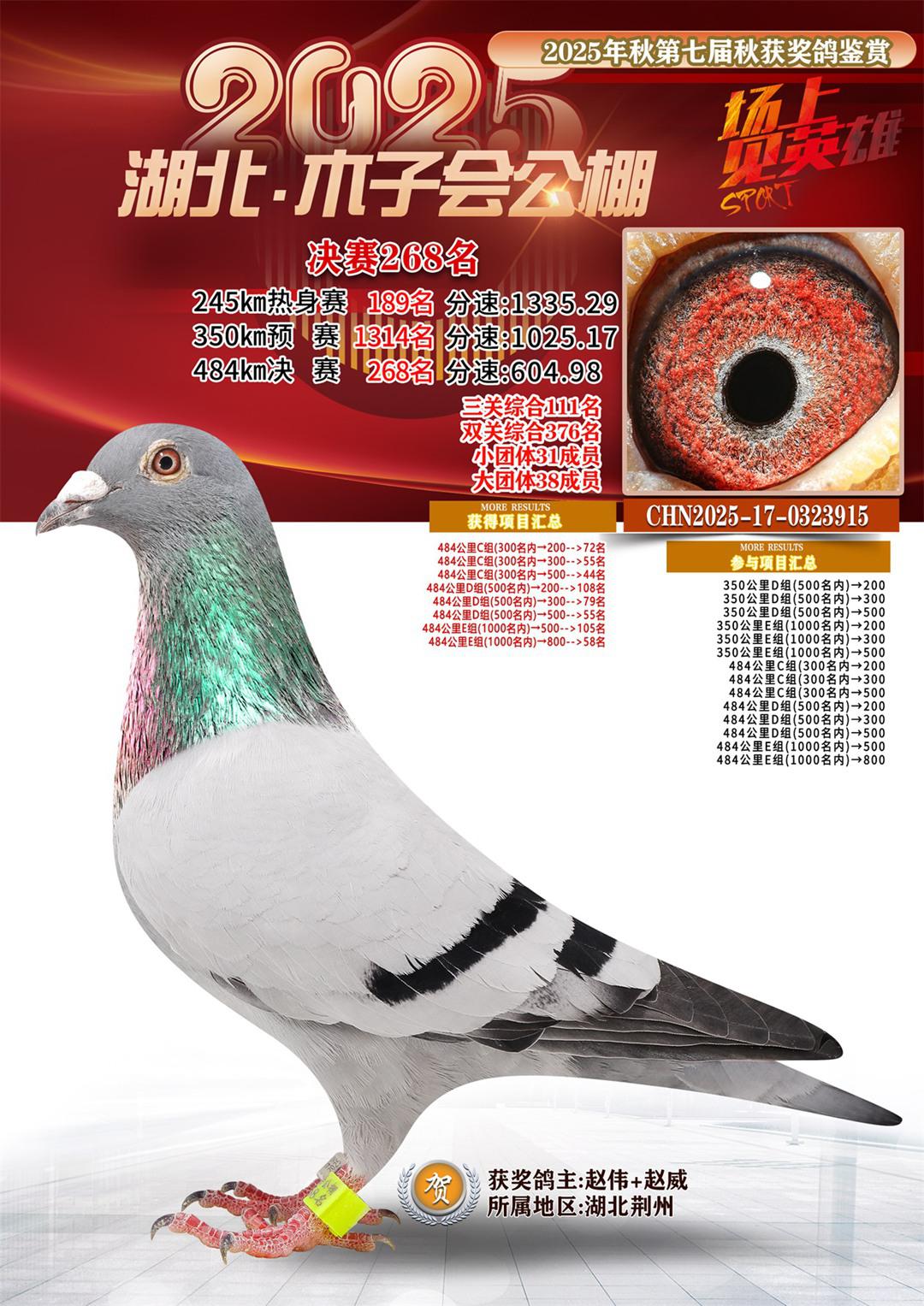 湖北省木子会公棚2025决赛268名赵伟+赵威17-0323915湖北荆州获奖鸽展示!