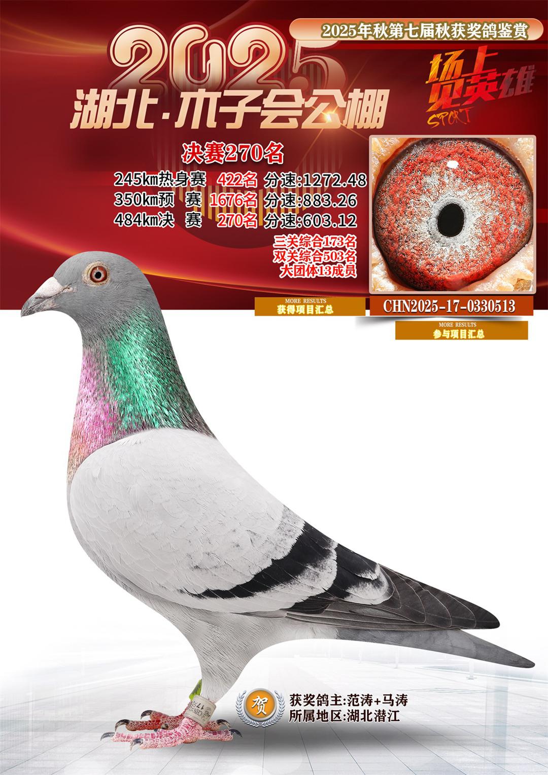 湖北省木子会公棚2025决赛270名范涛+马涛17-0330513湖北潜江获奖鸽展示!